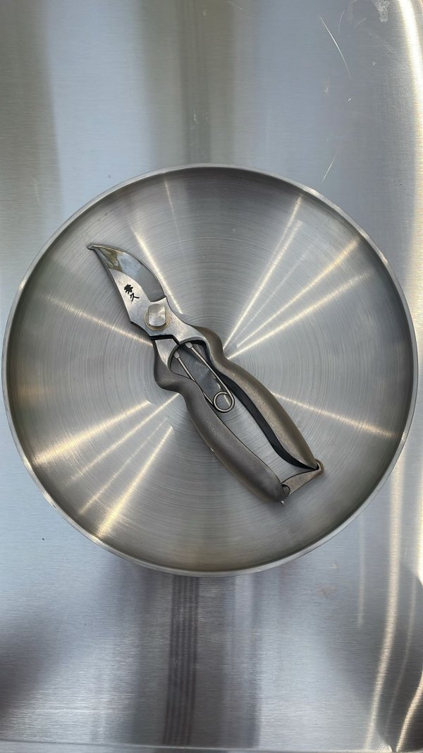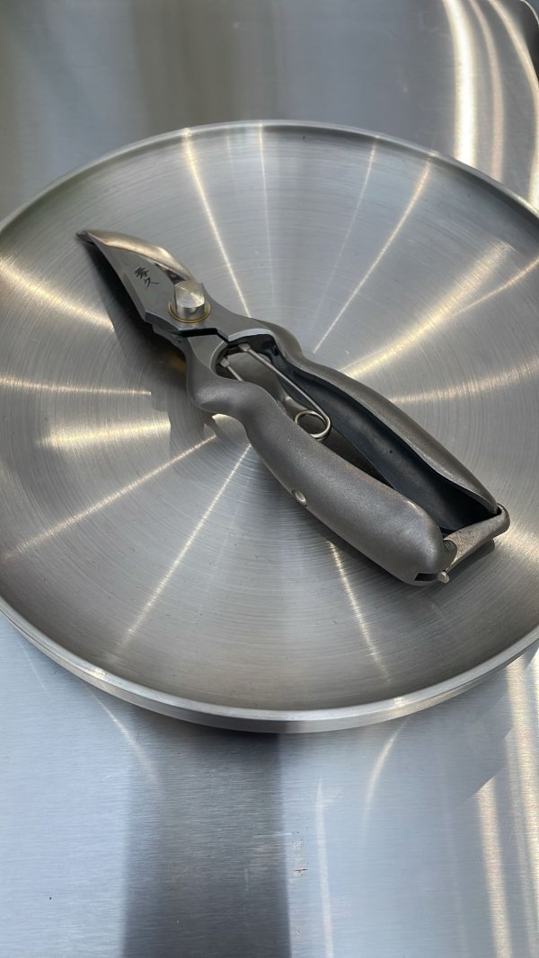 These shears are made from stainless steel – for cleaning and long-term storage, dry thoroughly after use and oil when necessary. Proper maintenance ensures sharpness and durability for many years.