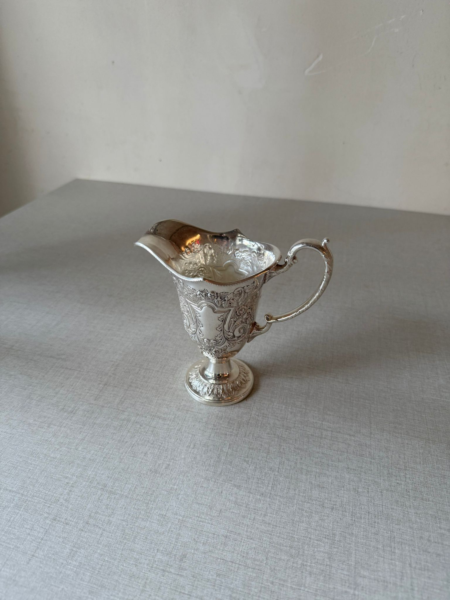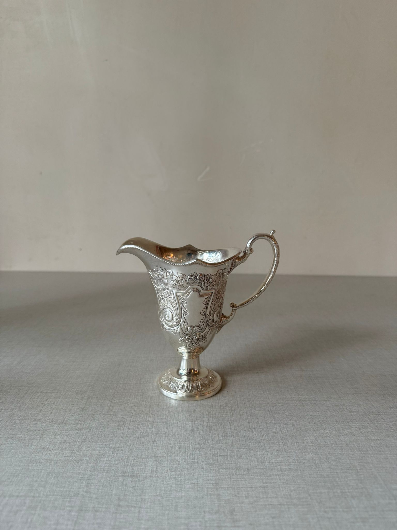 A beautifully crafted Victorian silver-plated cream jug, made in England between 1880 and 1899. The body features rich, hand-engraved floral and scroll embossing, typical of late 19th-century English silverwork, giving the piece an opulent and timeless character.