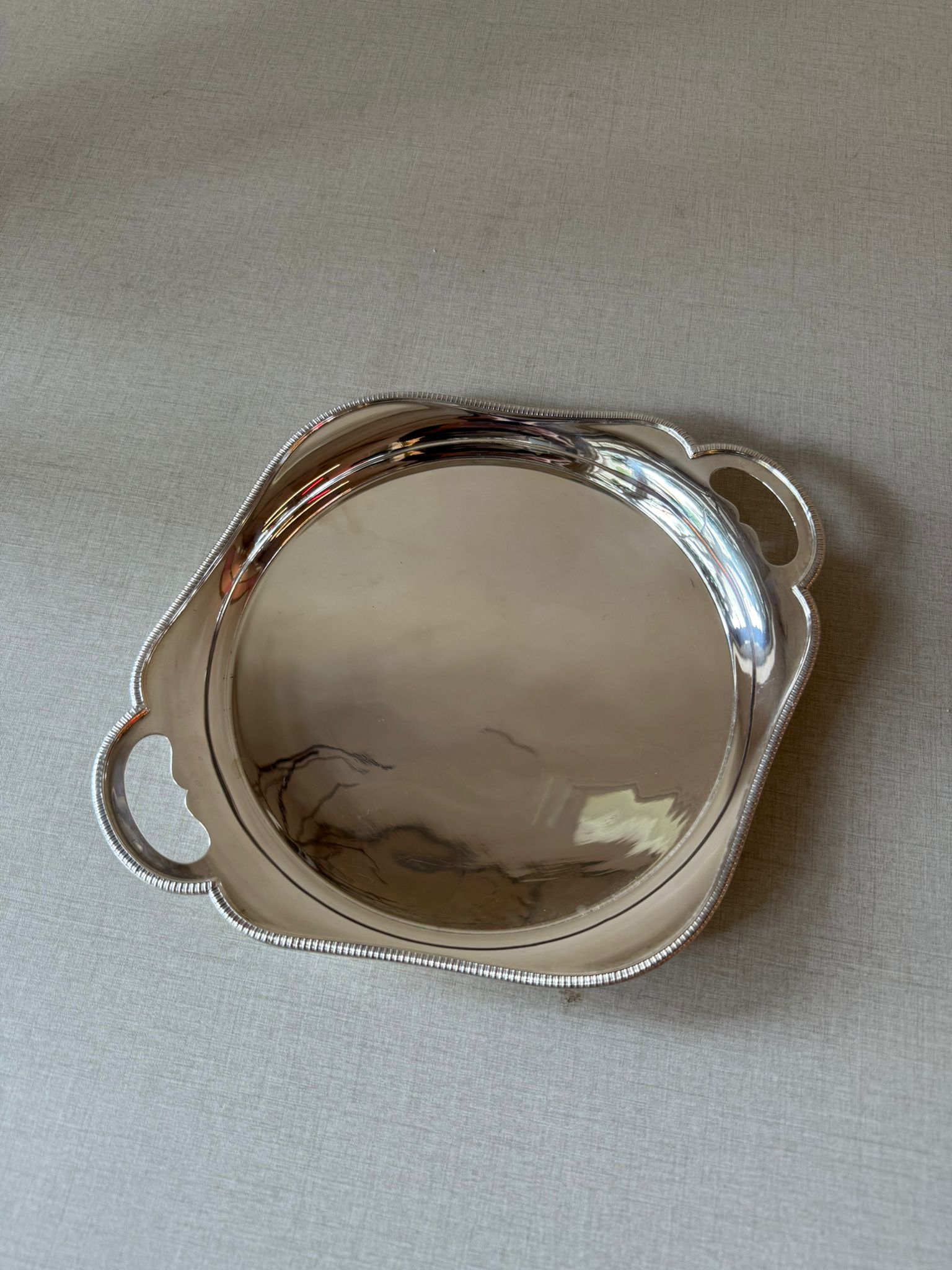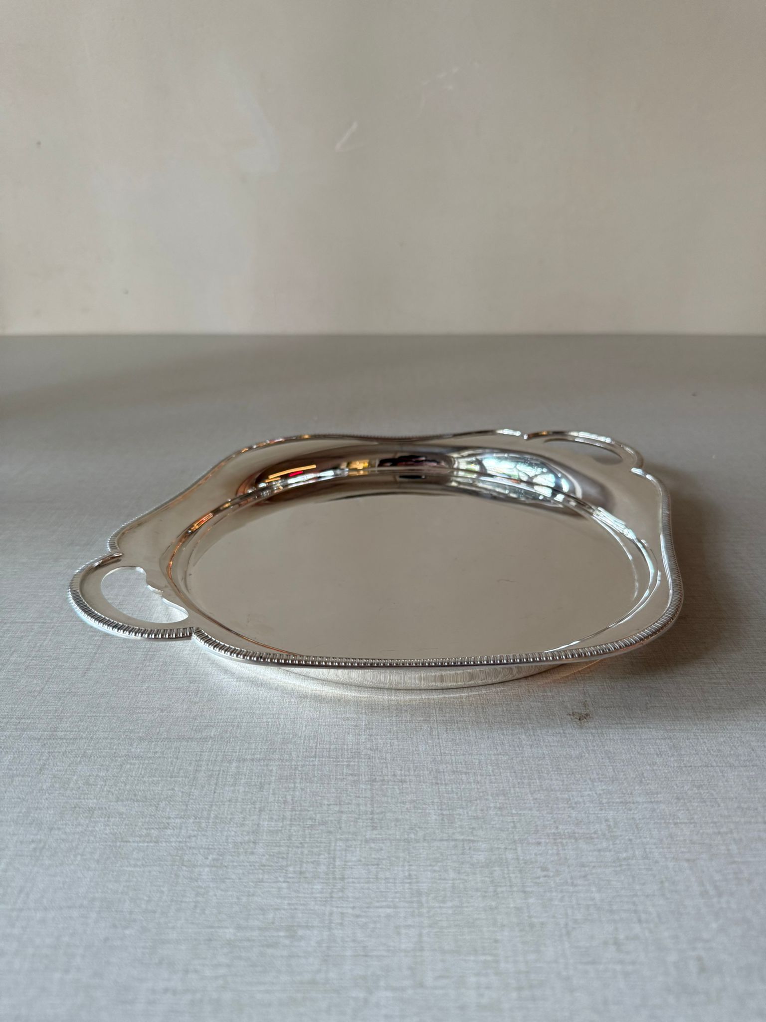 מגש הגשה אנגלי עתיק בציפוי כסף (Silverplate), שיוצר בין השנים 1840–1880, בעיצוב אלגנטי ונדיר מתקופת ה־Victorian Early–Mid. המגש מעוצב בצורניות רכה עם פינות מעוגלות ועדינות, ידיות אינטגרליות משני הצדדים ושוליים מעוטרים במסגרת “חרוזים” (Beaded Edge) קלאסית — סימן היכר של עבודת כסף מהמאה ה־19.