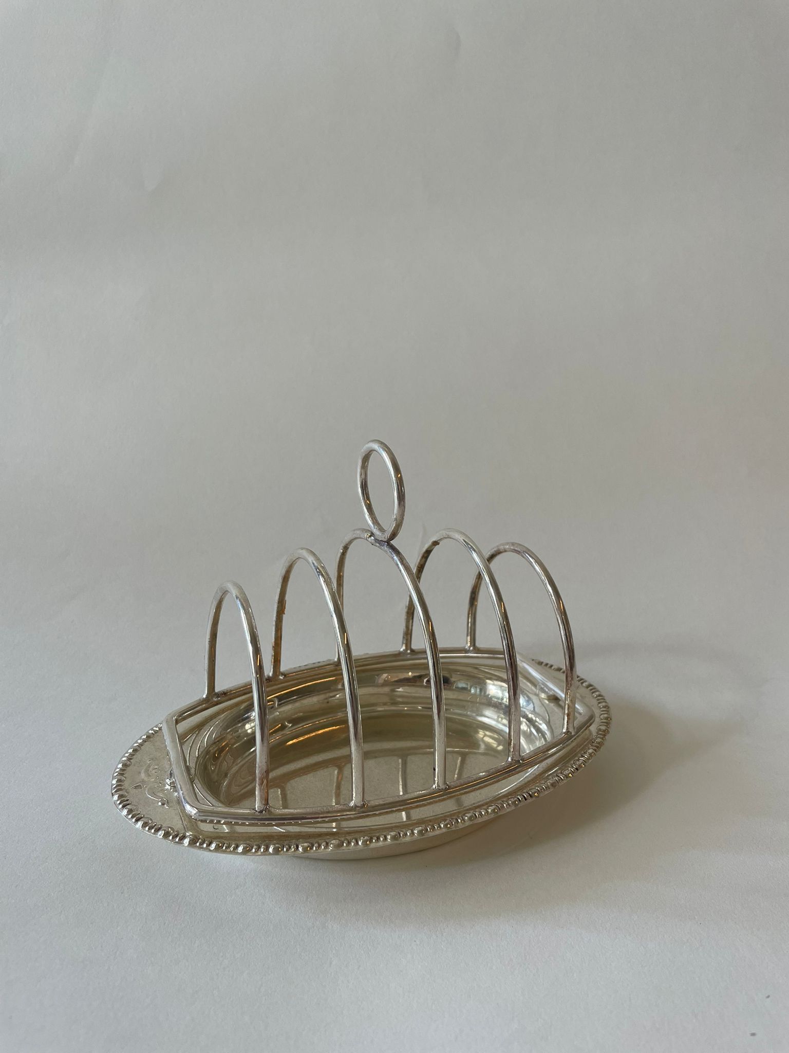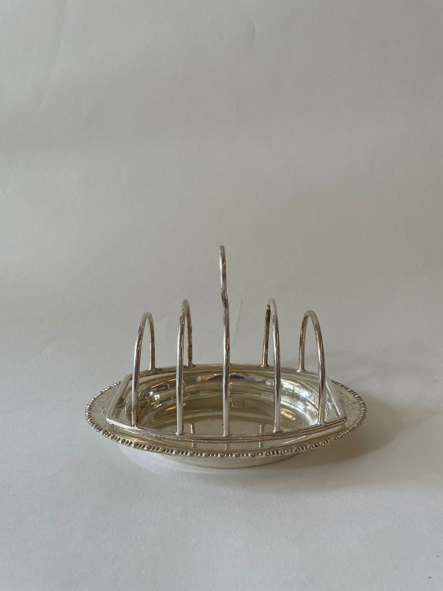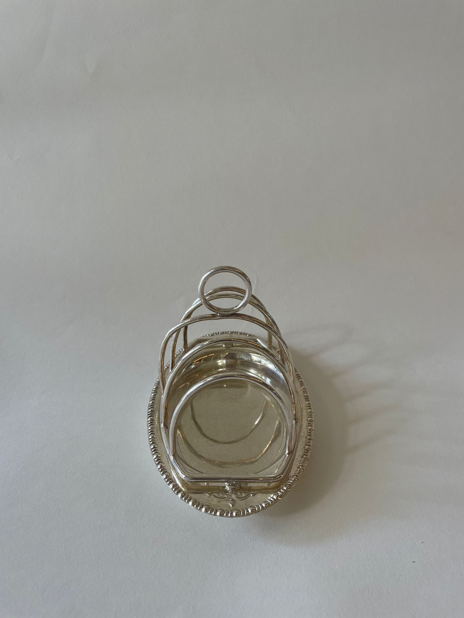 מתקן טוסטים קלאסי בסגנון שפילד, עשוי מתכת מוכספת ומשלב מעמד קשתות אלגנטי עם צלוחית תחתונה תואמת לאיסוף פירורים. העיצוב המאופק והידית העליונה יוצרים מראה מסורתי מוקפד, בהשראת כלי ארוחת הבוקר האנגליים של המאות ה-18 וה-19.