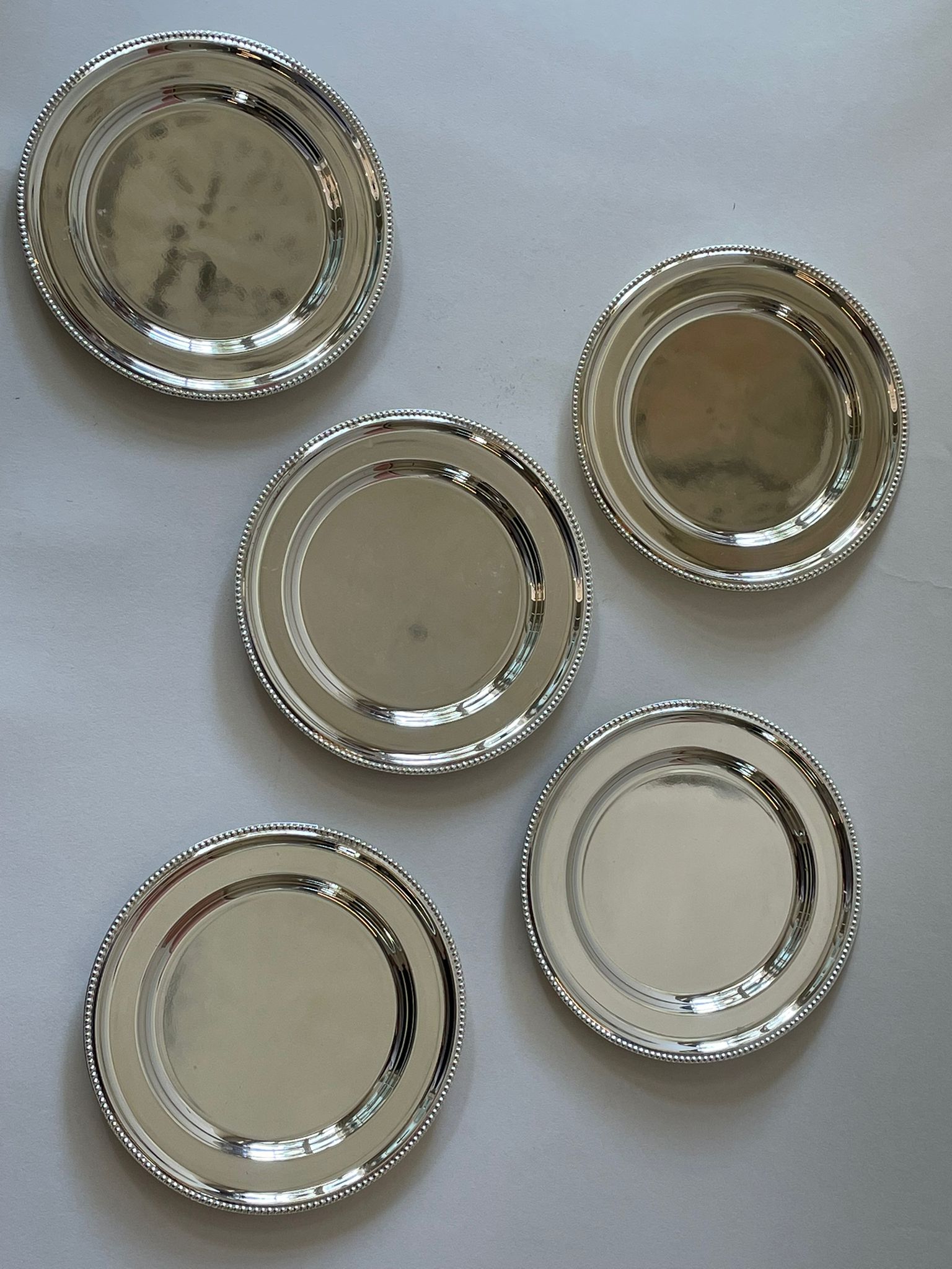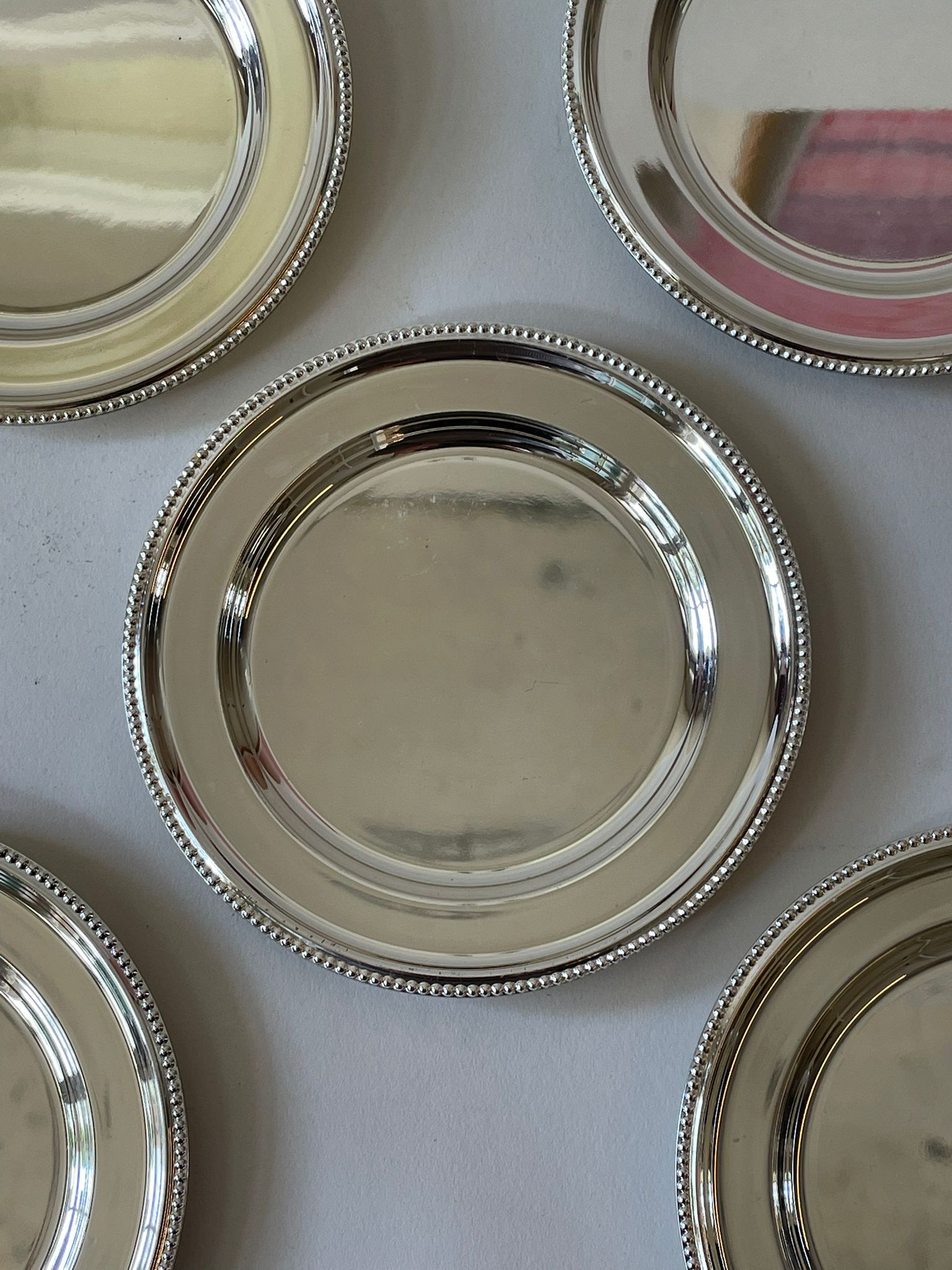 סט תחתיות אלגנטיות ממתכת מוכספת, בעלות שפה מעוטרת בפס חרוזים עדין והברקה רכה המשקפת אור באופן מאופק. הקווים הנקיים והעיצוב הקלאסי יוצרים מראה על-זמני המשתלב בקלות בכל שולחן — חגיגי או יומיומי.