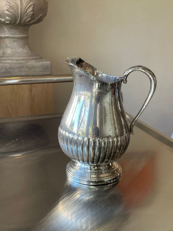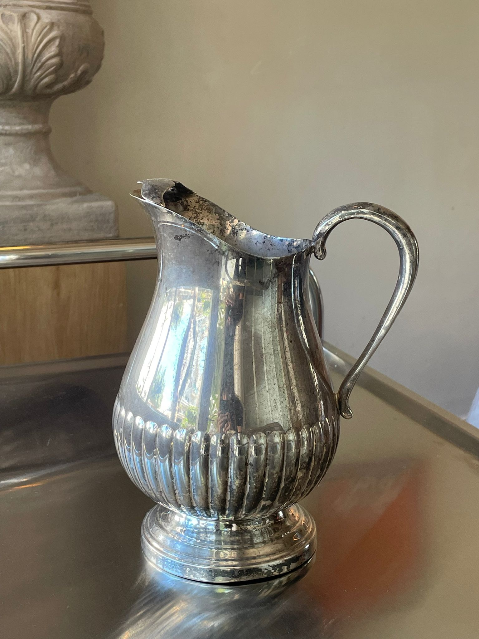 קנקן מתכת מצופה כסף בעבודת יד, בעל צורה רכה ומלאת נפח עם בסיס מורם וחריצים עדינים בתחתיתו. הגימור הנושא סימני זמן מוסיף לו אופי ותחושת היסטוריה – פריט שמספר סיפור של שולחן, טקס או אירוח.