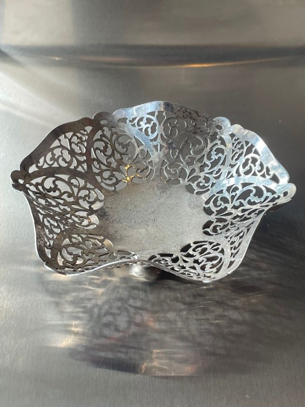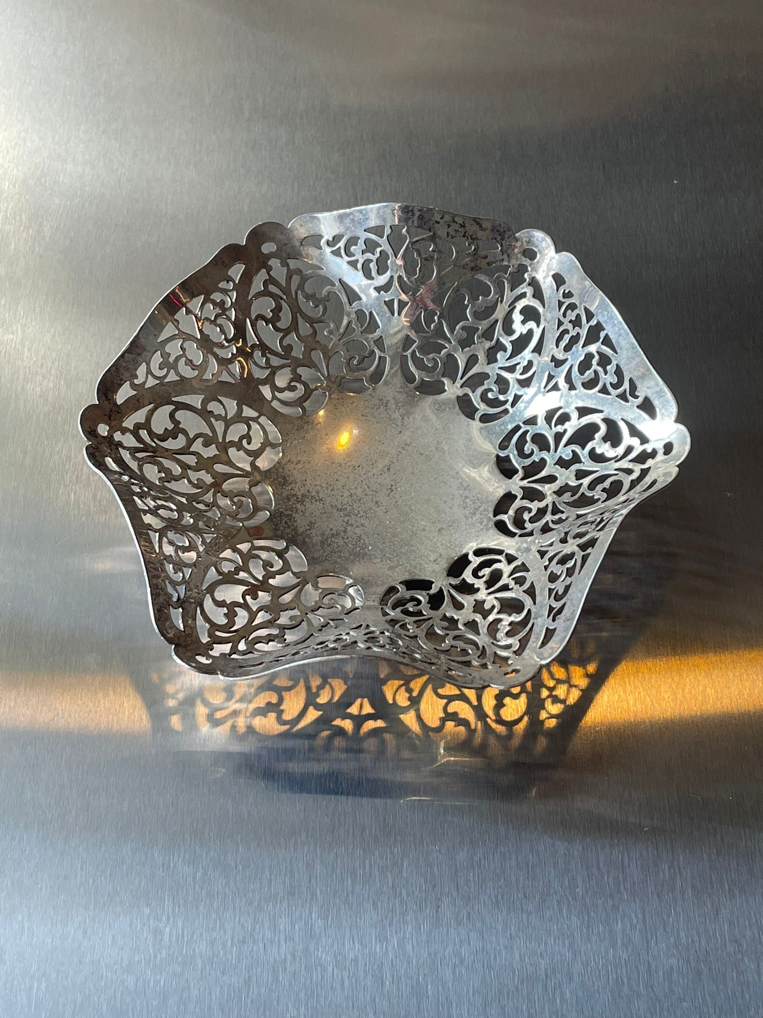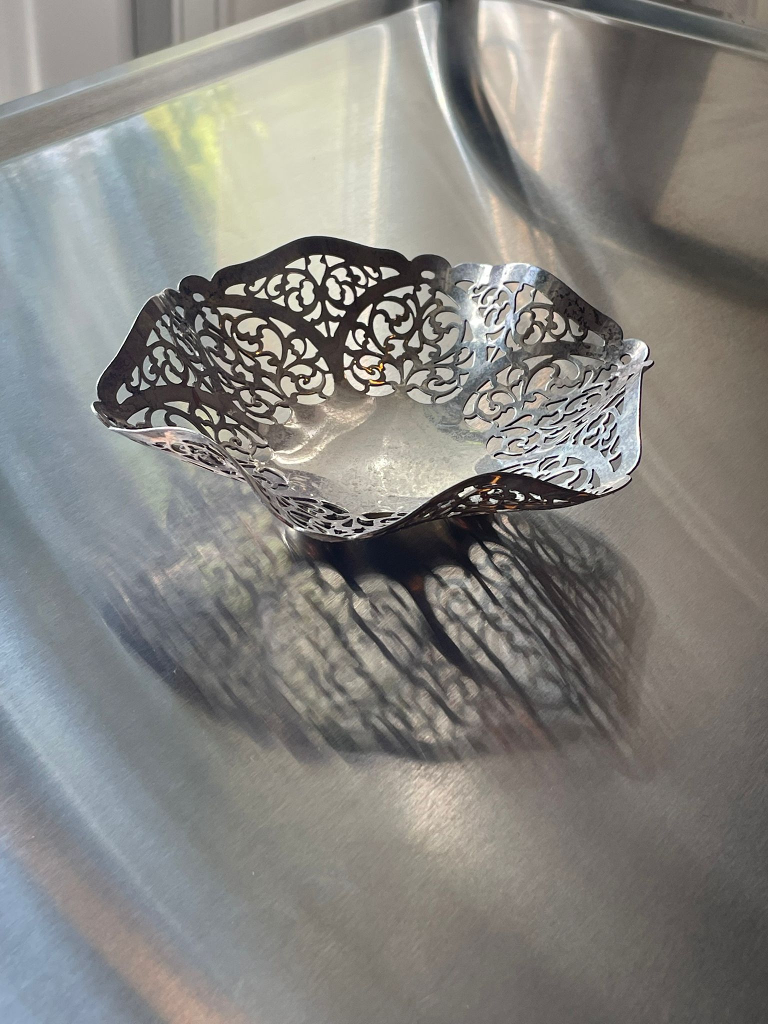קערה בעבודת יד עשויה מתכת בציפוי כסף, עם דוגמת תחרה מחוררת היוצרת משחק עדין של אור וצל. שפתה הגלית מעניקה לה צורה אורגנית ותחושת תנועה רכה.