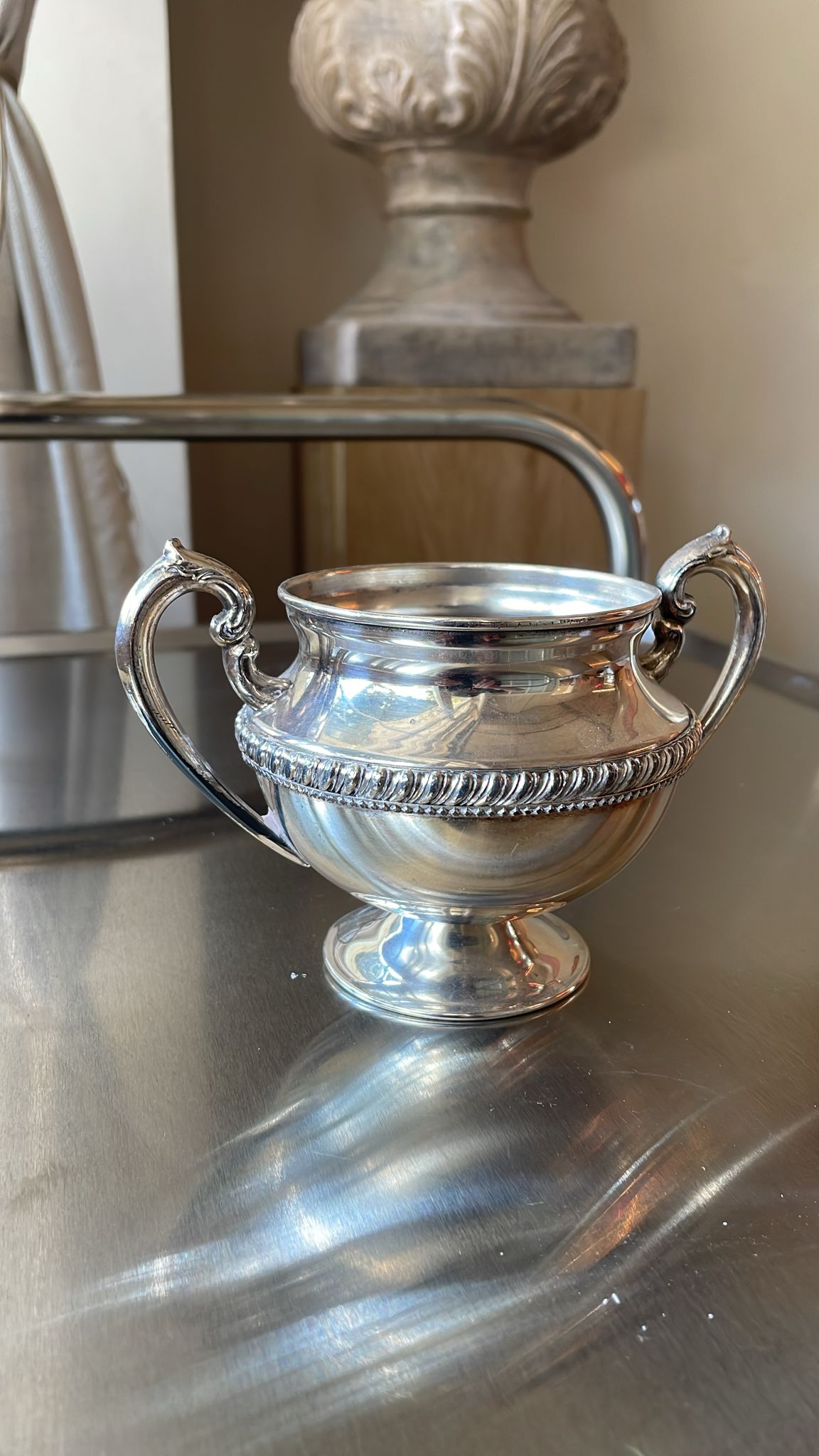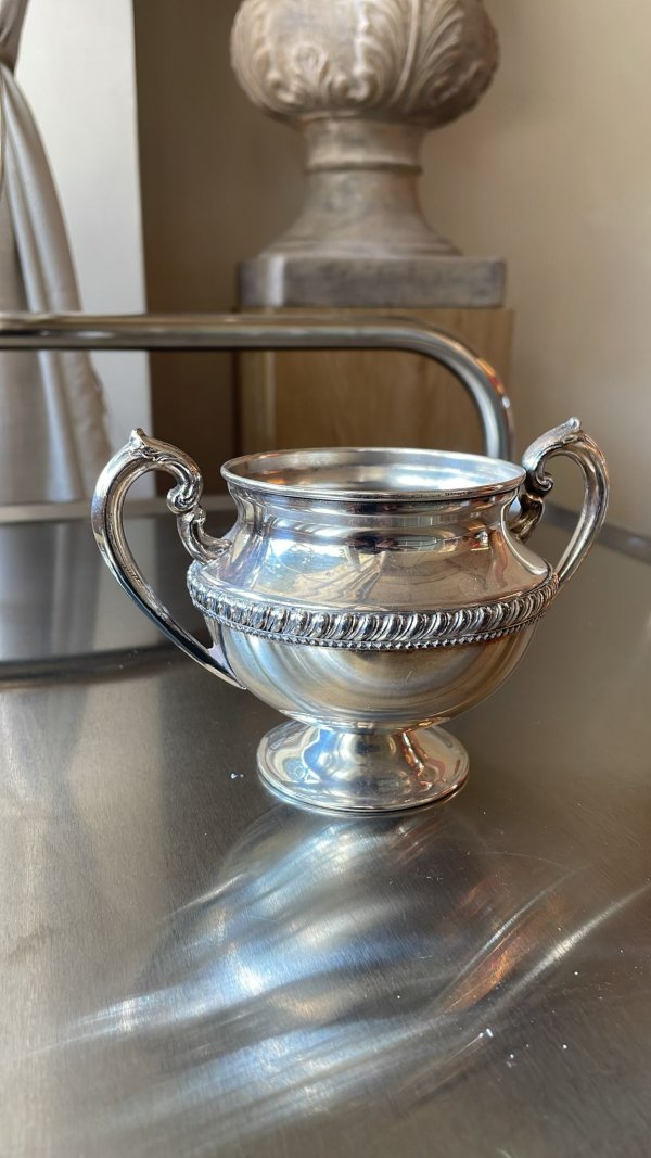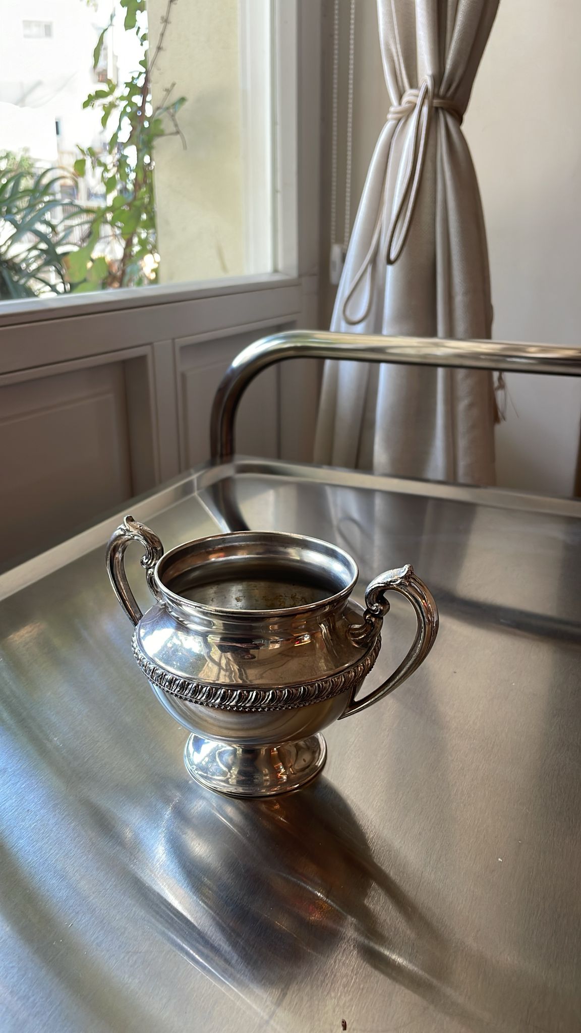 קערה קטנה בעבודת יד, עשויה מתכת בציפוי כסף, עם זוג ידיות מעוגלות ודוגמת שזירה עדינה סביב הגוף. הצורה הקלאסית מעניקה לה נוכחות שקטה ומאוזנת, בין אם מוצגת כשלעצמה ובין אם משמשת ככלי לאירוח או לעיצוב שולחן.