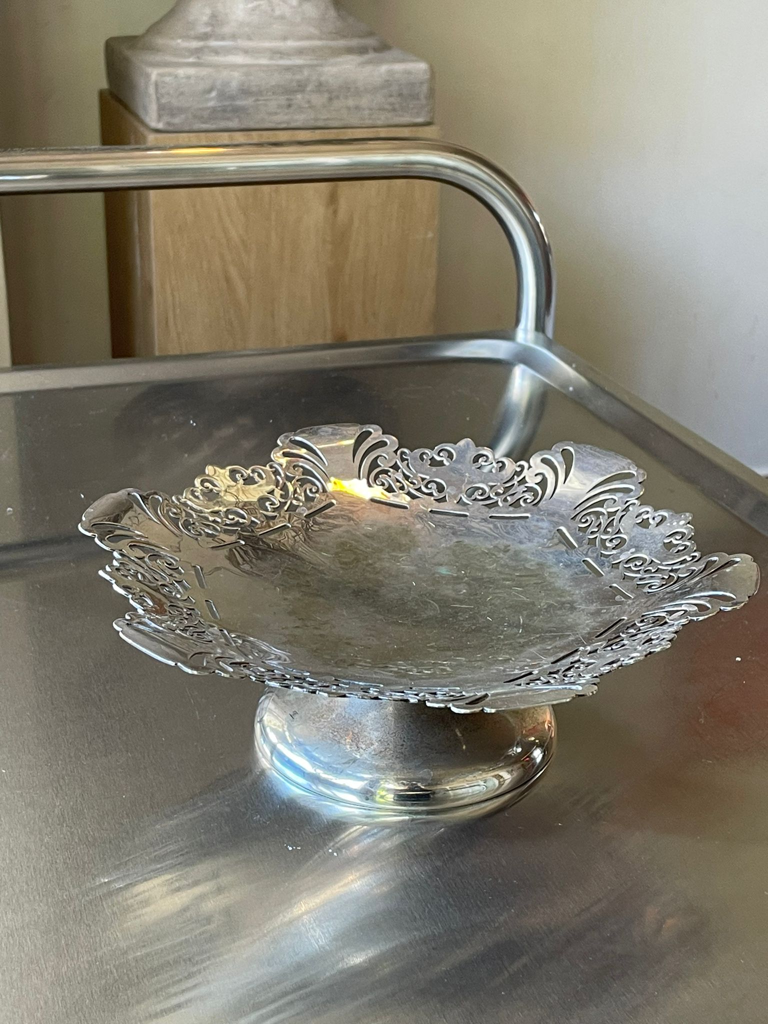 קערה בעבודת יד עשויה מתכת בציפוי כסף, עם רגל מרכזית רחבה ודוגמת חיתוך דקורטיבית לאורך שפתה. העיטור המחורר יוצר משחק עדין של אור וצל, והגימור המבריק מוסיף לה תחושת רכות וטקסיות.