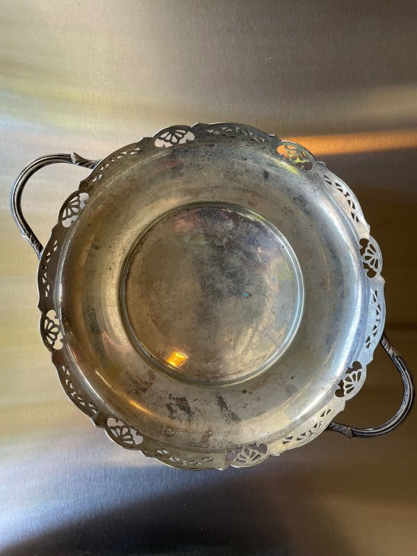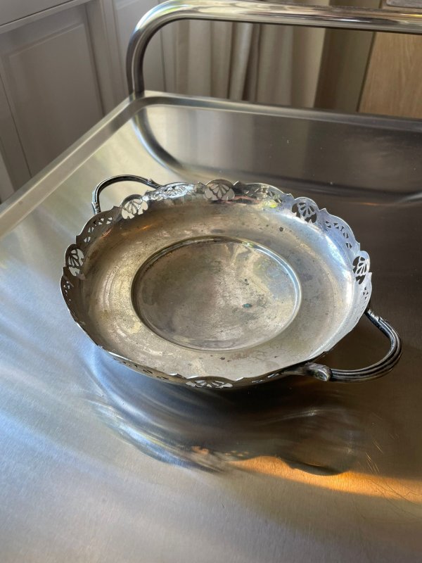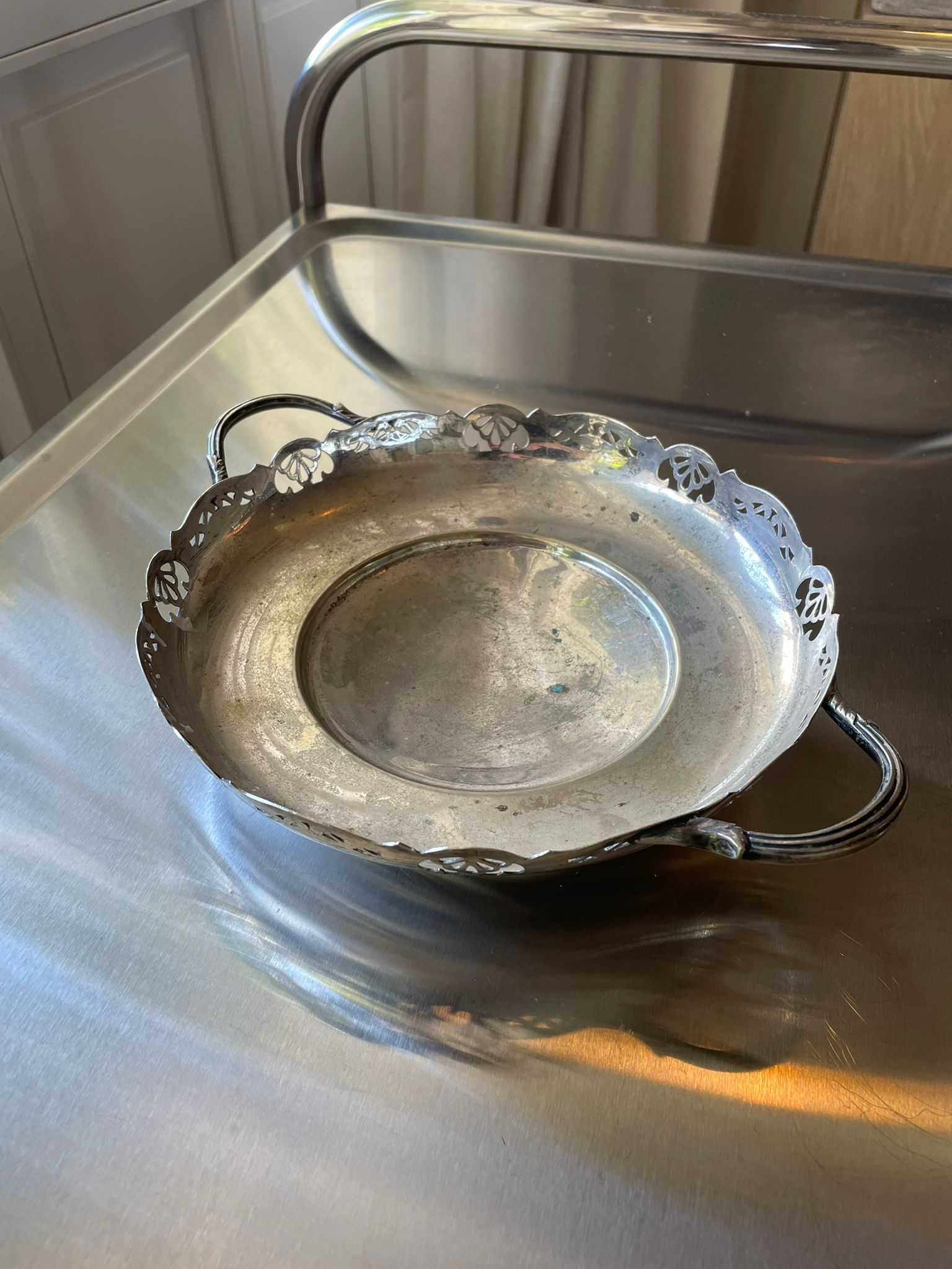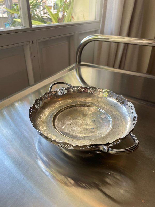 קערה עגולה בעבודת יד, עשויה מתכת בציפוי כסף, עם שתי ידיות צד עדינות ודוגמת חיתוך פרחונית לאורך שפתה. השילוב בין המתכת המוברקת לעיטור המחורר יוצר איזון עדין בין תחושת מלאכת יד למסורת קלאסית.
