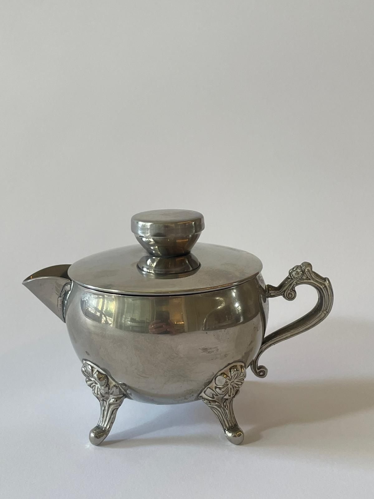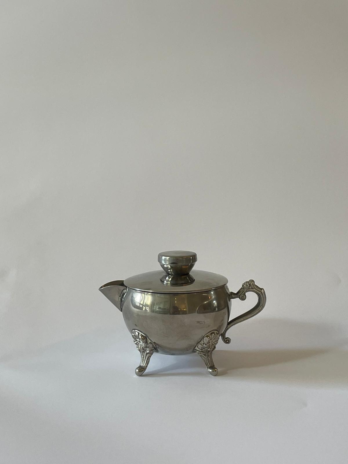 כלי סוכר אלגנטי ממתכת מוכספת, בעל גוף מעוגל הנשען על שלוש רגליים דקורטיביות ועיטור עדין בידית האחיזה. המכסה התואם משלים את הצללית הקלאסית ויוצר מראה חגיגי אך מאופק, בהשראת כלי האירוח האירופאים המסורתיים.