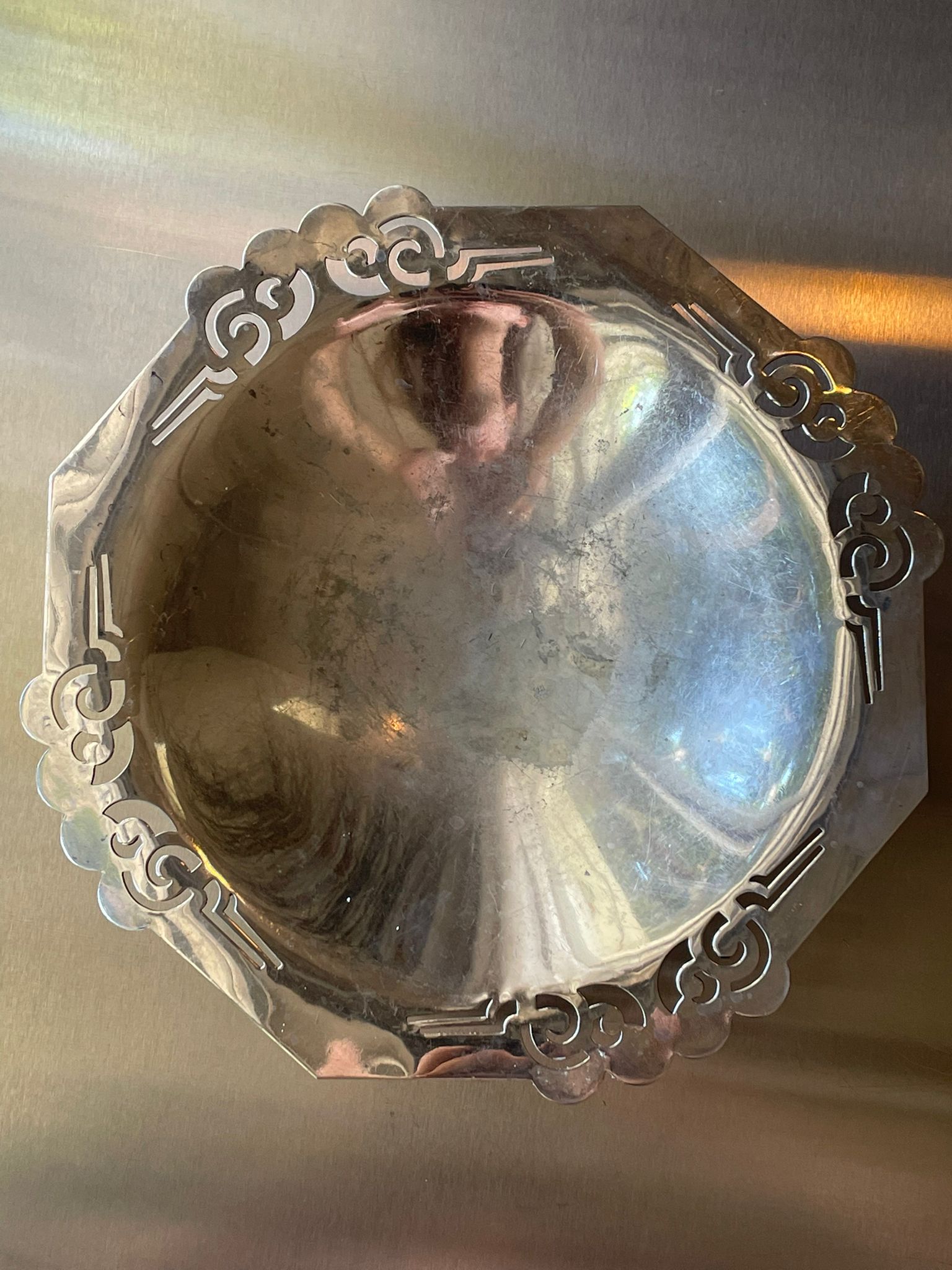 קערת מתכת בעבודת יד בציפוי כסף, עומדת על בסיס מוגבה, עם שפה בעיצוב גיאומטרי מחורר המעניק לה מראה קלאסי ומאוזן. הקימור הרך של גוף הקערה והגימור המבריק יוצרים נוכחות אלגנטית ונקייה.