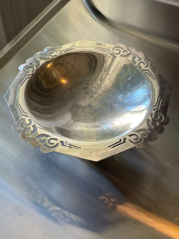 קערת מתכת על רגל בעבודת יד בעיטור גיאומטרי