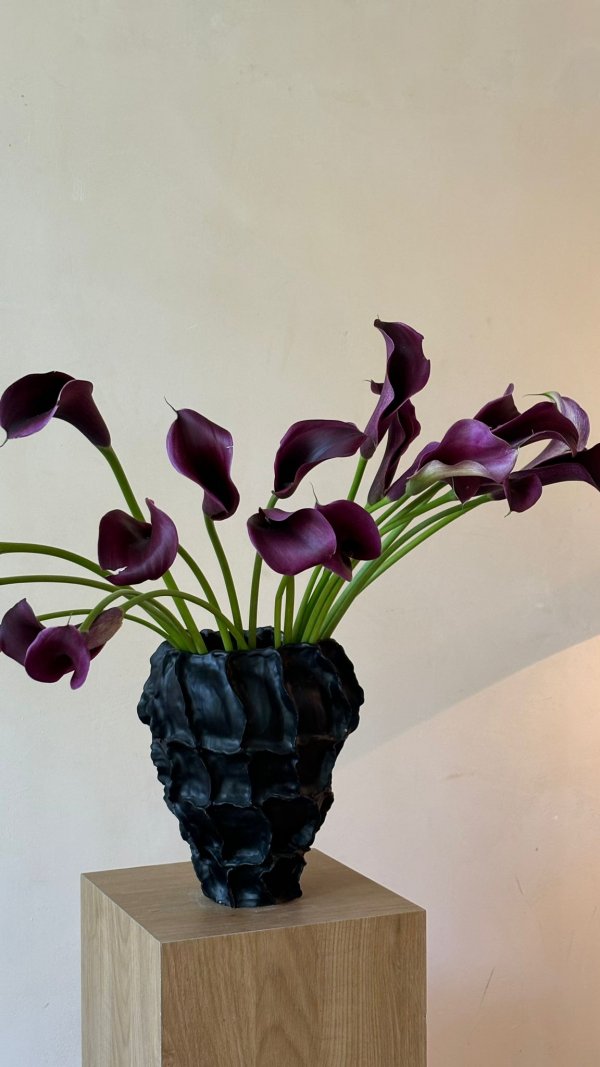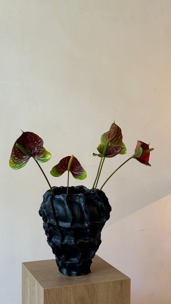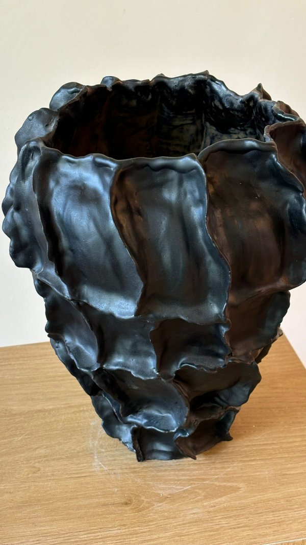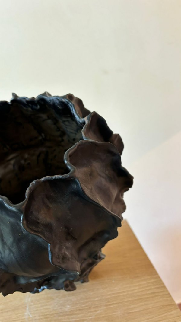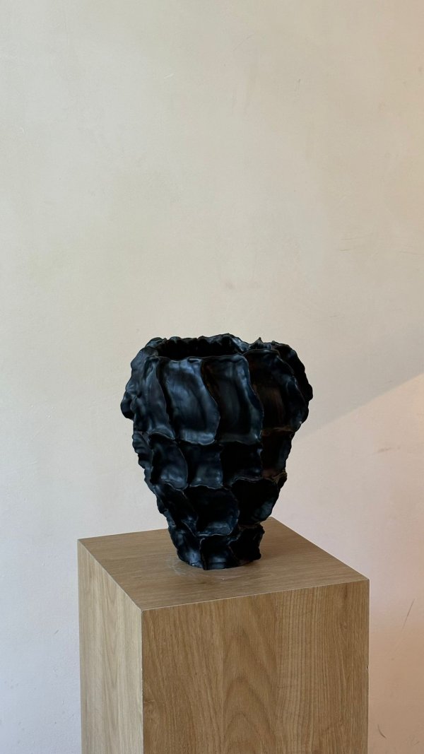 אגרטל פיסולי עשוי קרמיקה שחורה, בעל מרקם גולמי ועומק חומרי מרהיב. פני השטח החספוסים נראים כמעט כמו קיפולי בד או סלע מותך, ומעניקים לאגרטל נוכחות דרמטית ועכשווית.