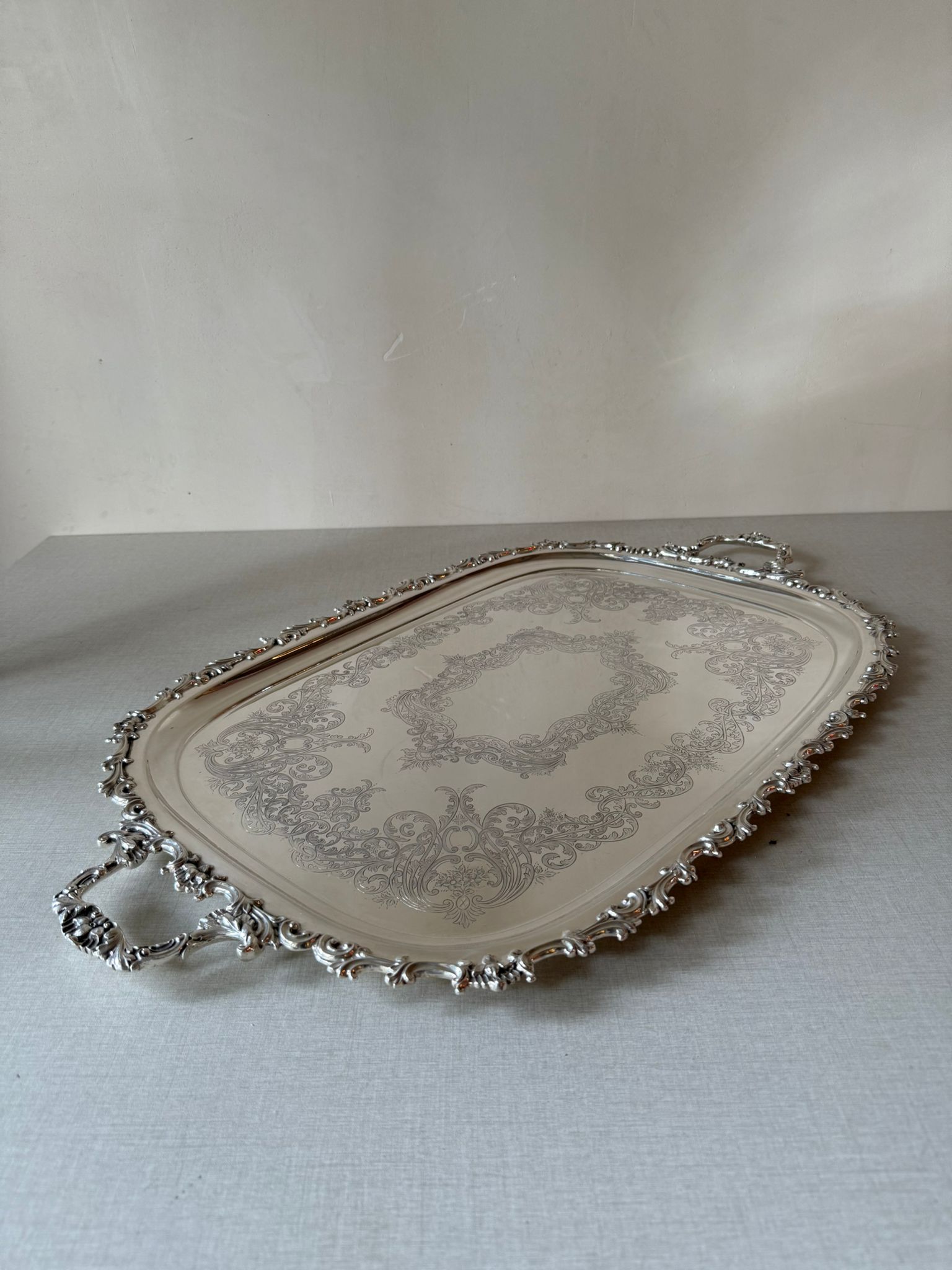 המגש כולל ידיות מפוסלות משני הצדדים ושפה חיצונית עשירה בקימורים ותבליטי מתכת דקורטיביים—מאפיין מובהק של כלי כסף אנגליים מהמחצית הראשונה של התקופה הוויקטוריאנית. פני המגש מעוטרים בחריטה מורכבת היוצרת מסגרת מרכזית אלגנטית, והגימור המבריק מעניק לו נוכחות יוקרתית ועשירה.