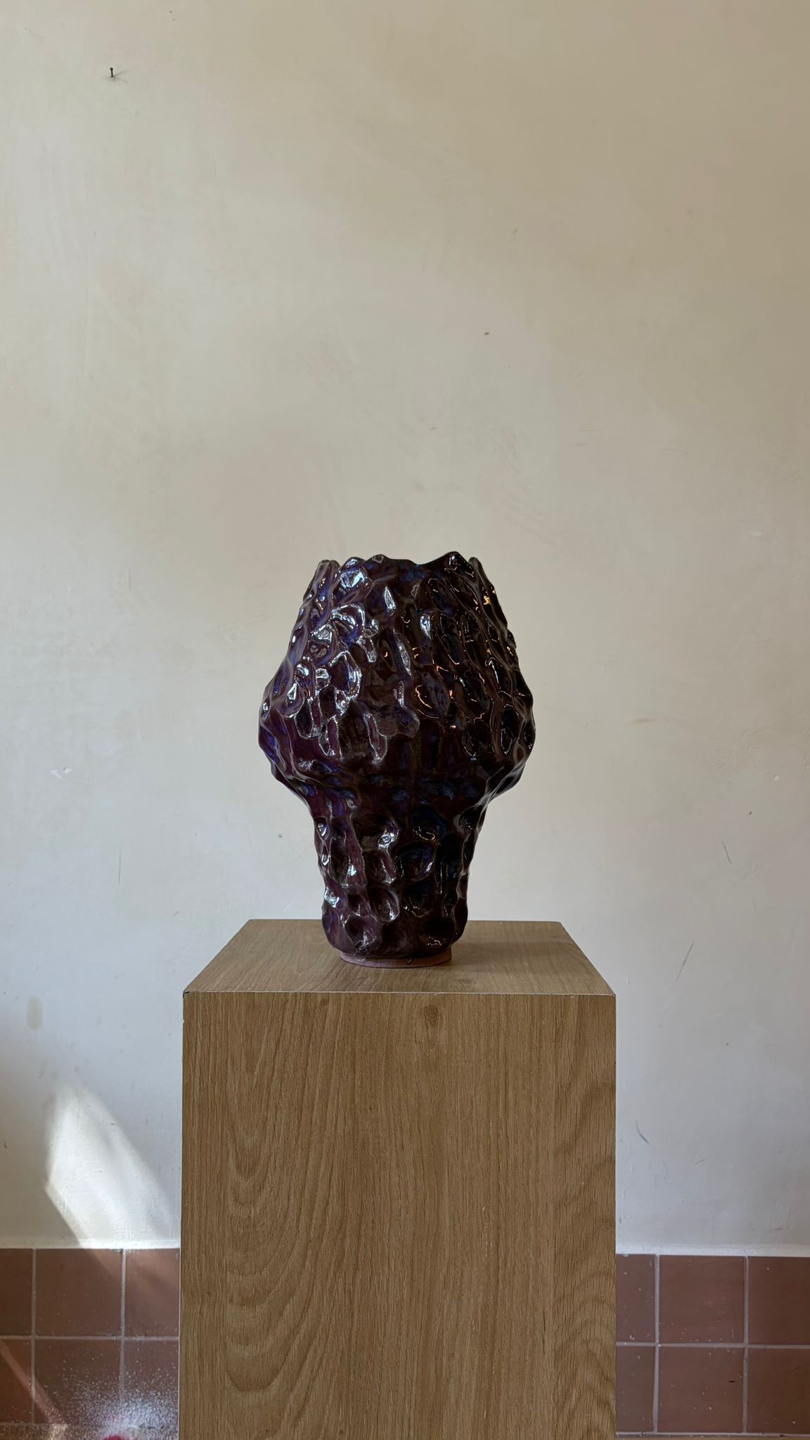 הצורה הסגורה והמאוזנת מעניקה לאובייקט יציבות ונוכחות שקטה אך משמעותית, בעוד הגלזורה המבריקה בגוונים עמוקים של סגול כהה, חום ושחור יוצרת עומק והשתקפויות משתנות.
