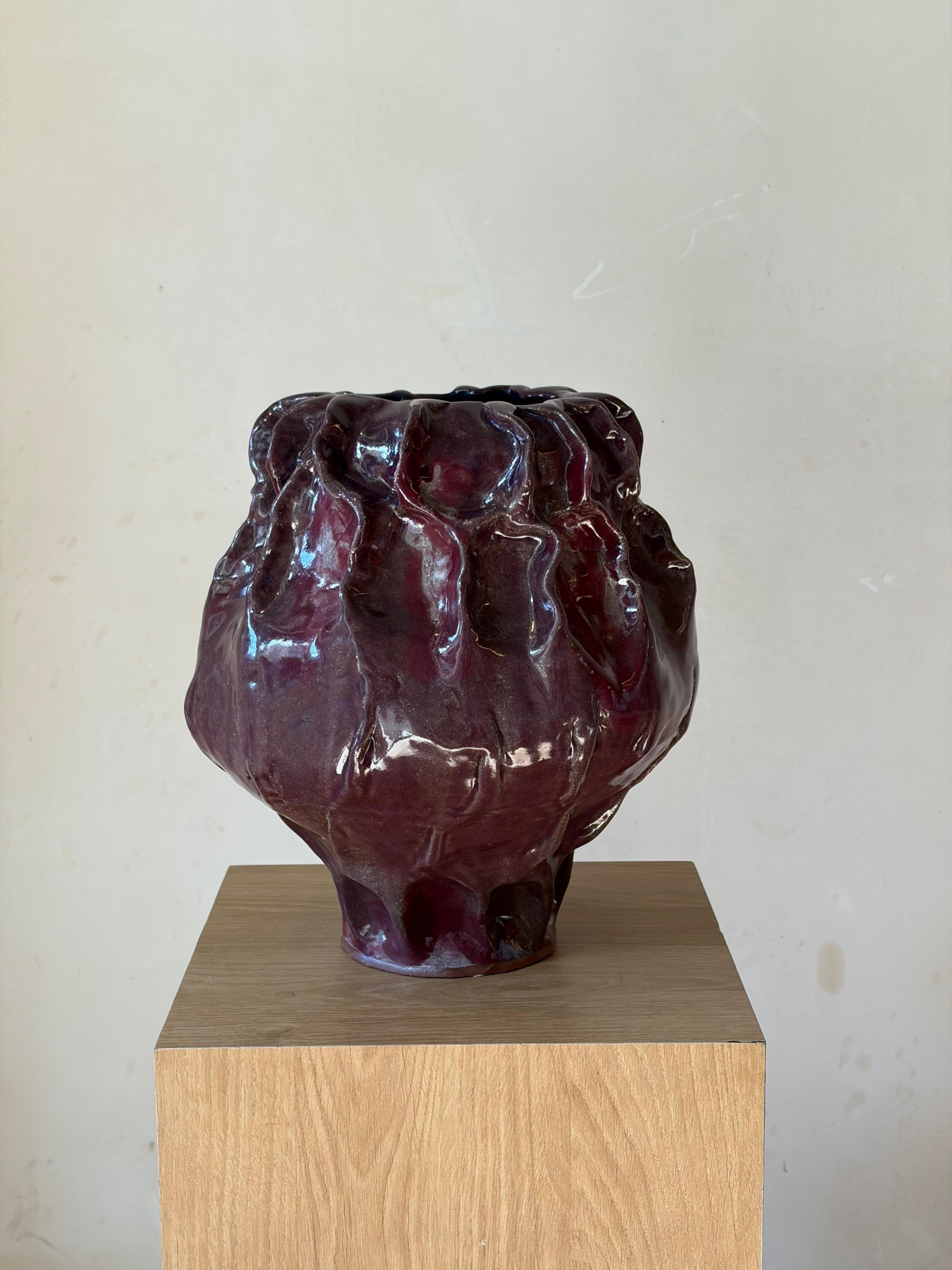 אגרטל בגוון בורדו עמוק, רחב ונמוך, עם תנועה רכה וקפלים המדגישים את עבודת היד. מתאים במיוחד לסידורי שולחן נמוכים, ענפים דרמטיים או כפסל קרמי בפני עצמו.