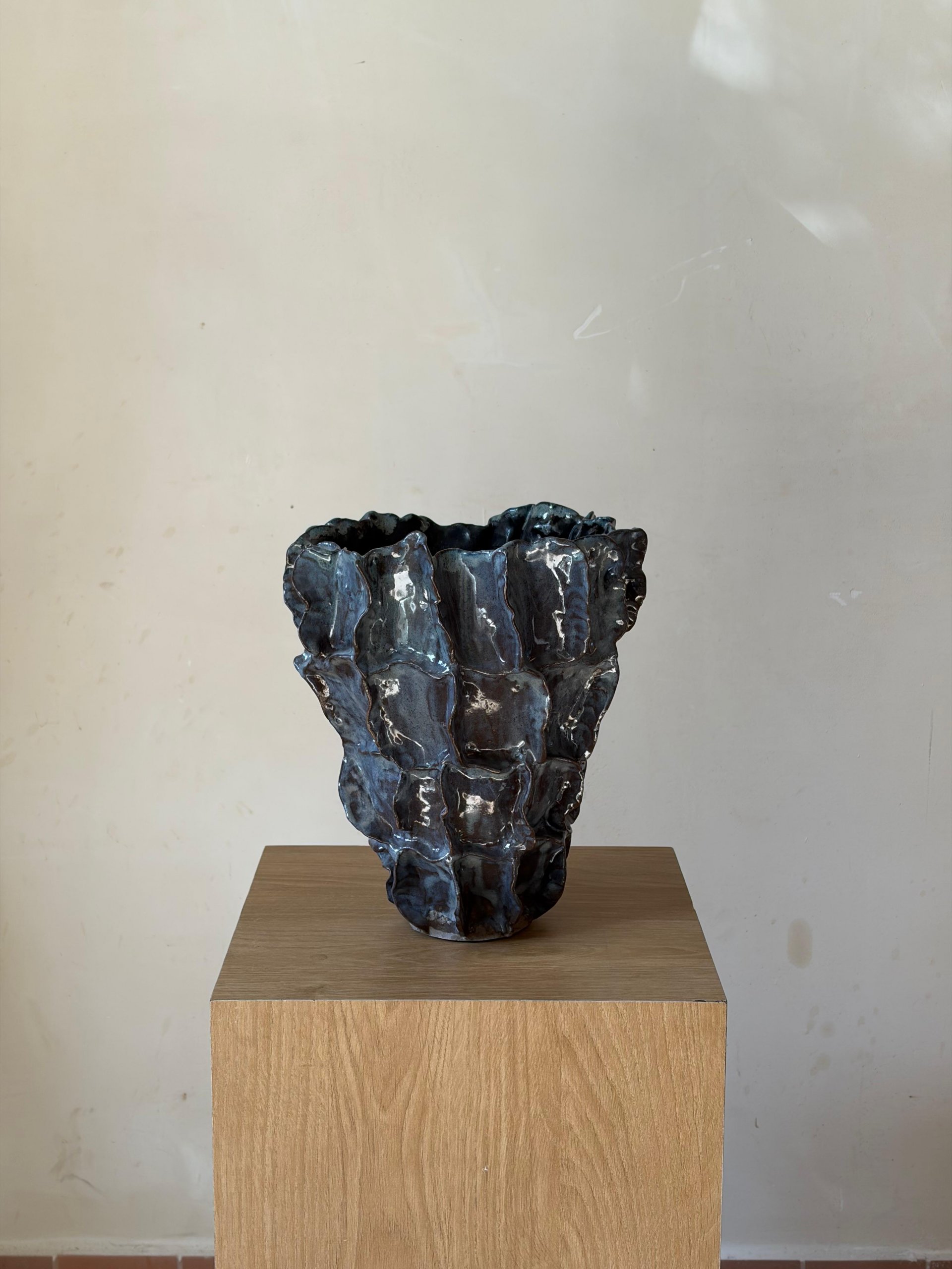 אגרטל רחב בעל טקסטורה עמוקה המזכירה מבנה סלעי טבעי. גווני כחול־אפור עם ברק עדין יוצרים תחושת תנועה וחומר חי. פריט פיסולי בעל נוכחות מרשימה.