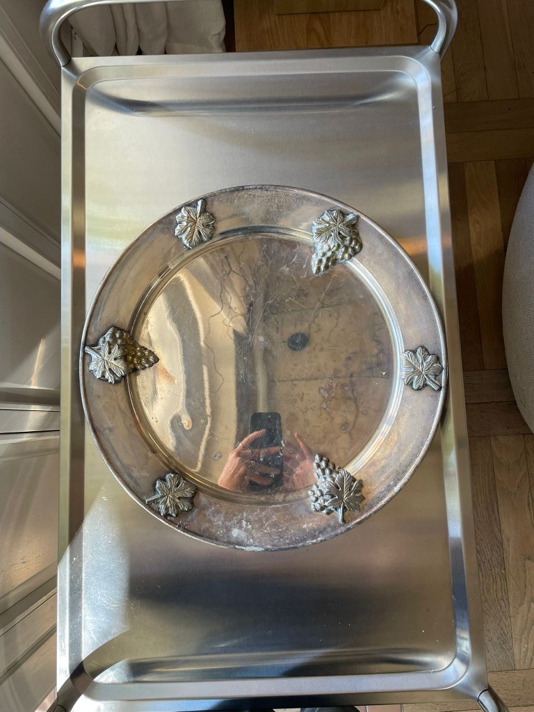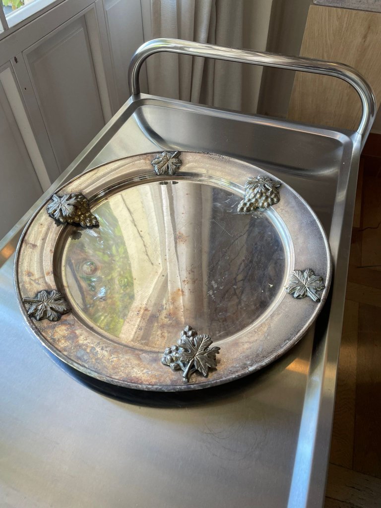 מגש עגול מצופה כסף עם עיטורי ענבים ועלים