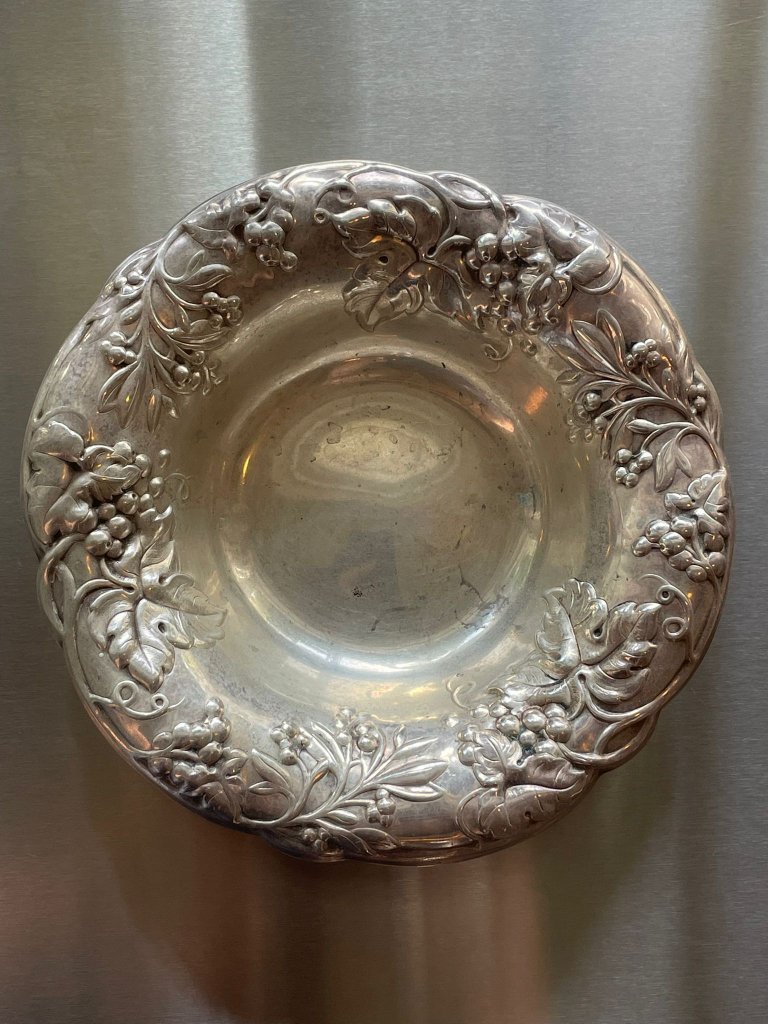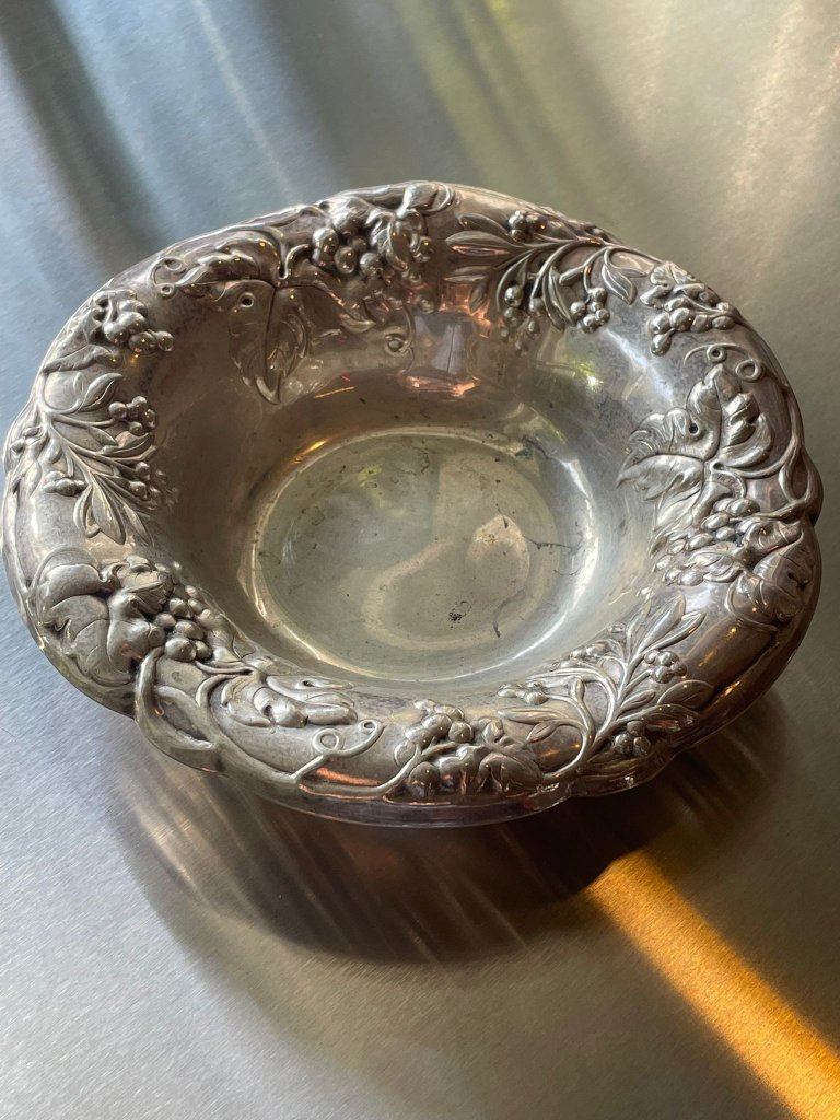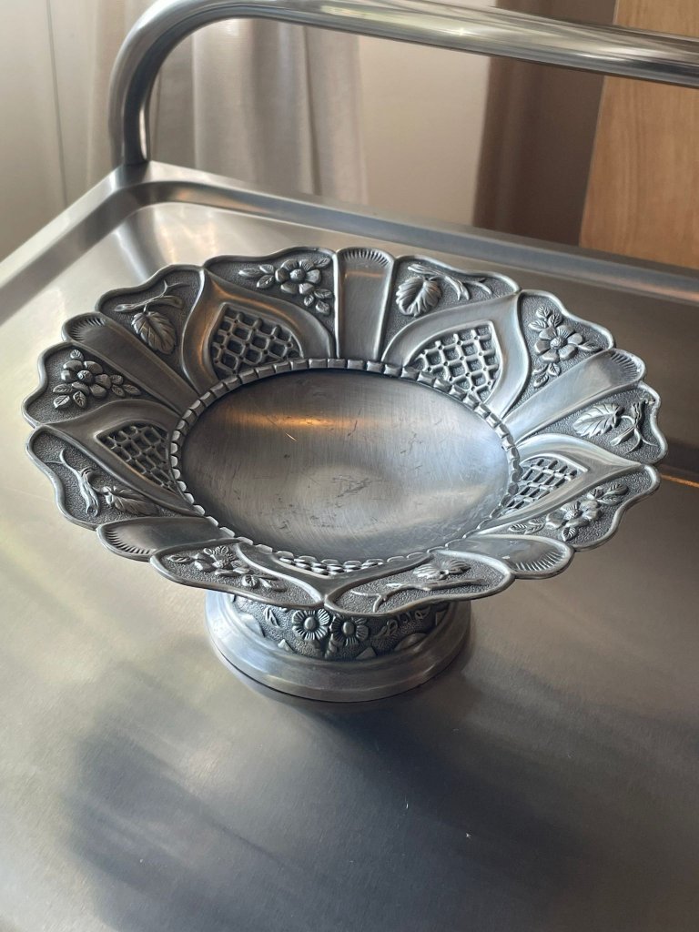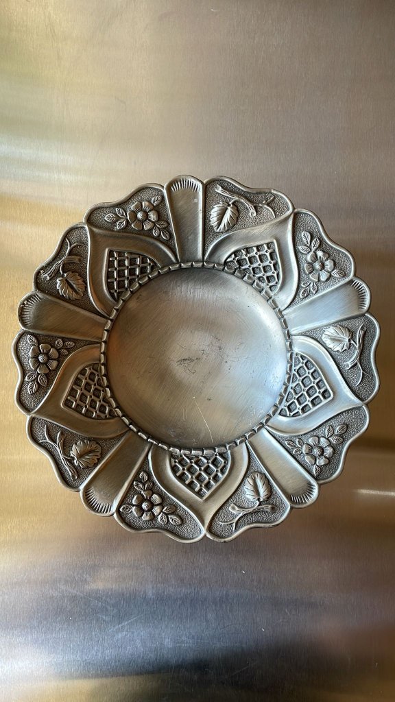 קערת מתכת מצופה כסף בעיטור תבליט פרחוני